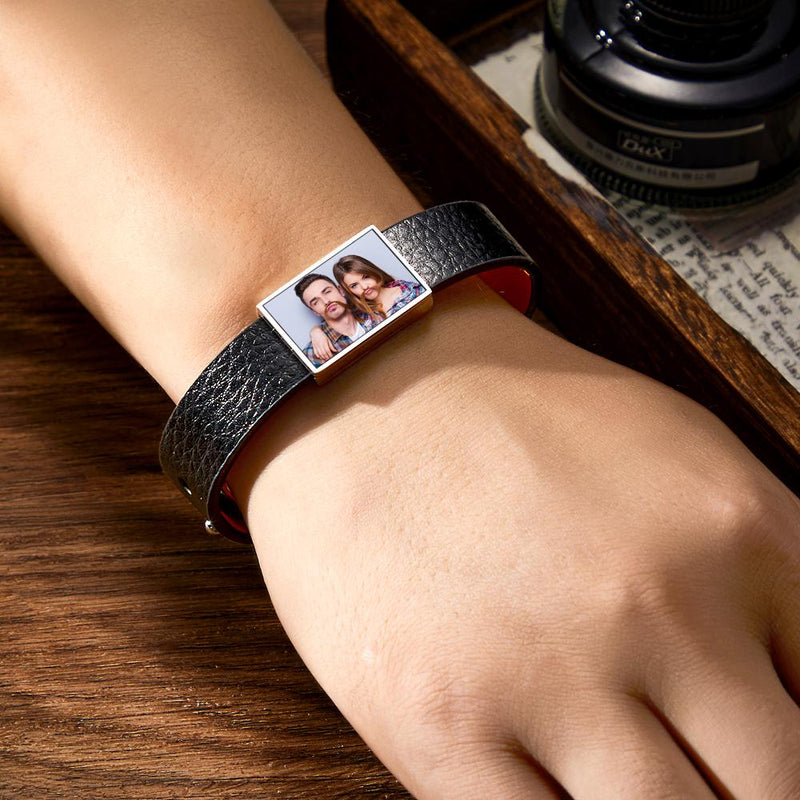 Create a truly unique and sentimental gift with our Personalized Photo Leather Bracelet. Crafted with genuine leather and featuring a customizable photo charm, this bracelet is the perfect accessory for men. Preserve a cherished memory or showcase a special someone with this one-of-a-kind piece. Surprise your loved ones with this personalized keepsake that combines style and sentimentality.