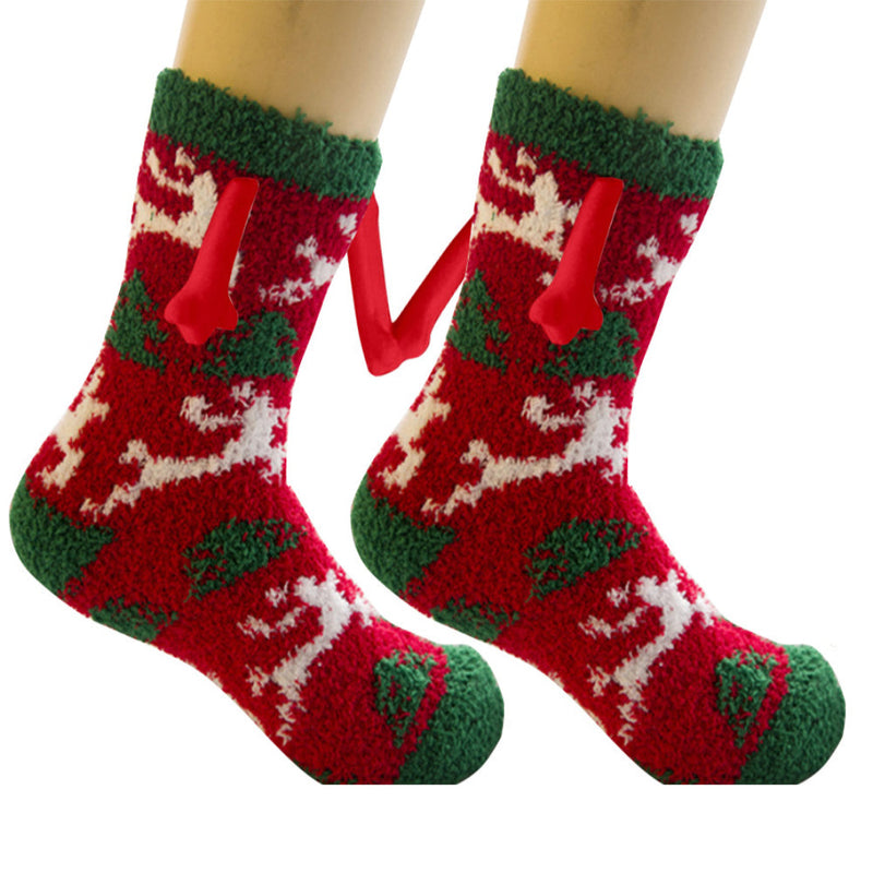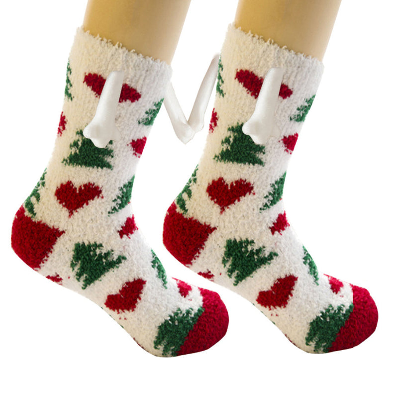 The arms on both sides of these Christmas hand-in-hand socks have built-in magnets that create an attraction when you get close, allowing you to hold hands with your partner. Made from high-quality material, these socks are both comfortable and durable. Get a pair for yourself or give it as a gift to someone special. Spread some joy with our funny magnetic hand-in-hand Christmas socks!