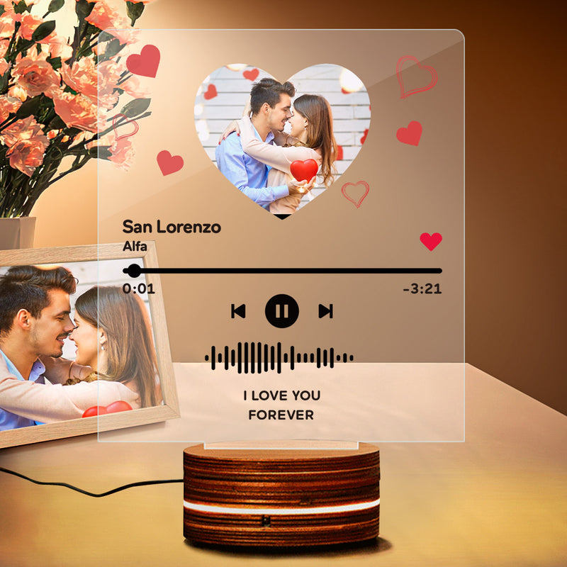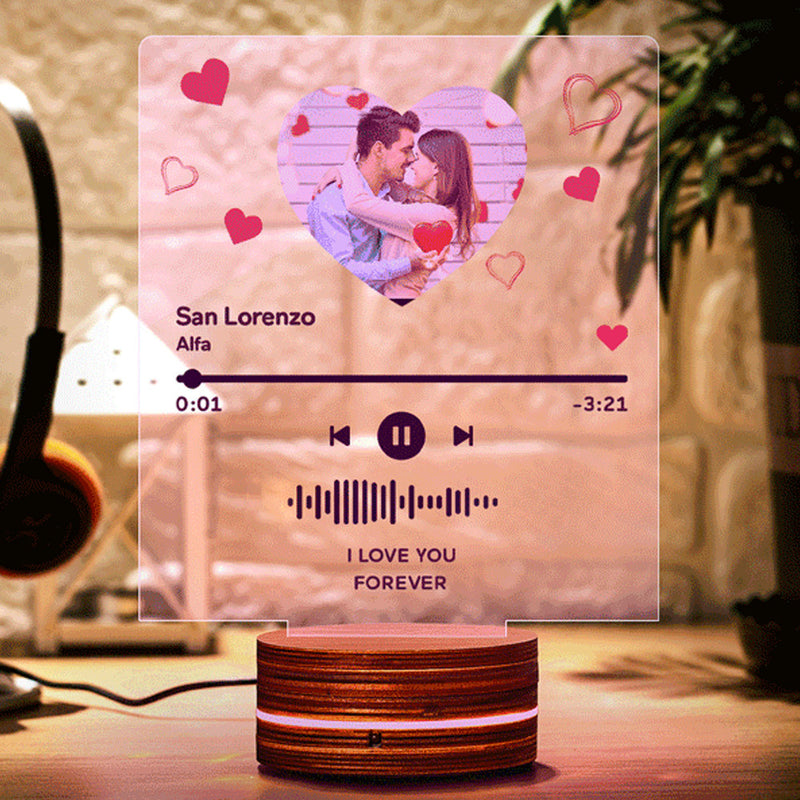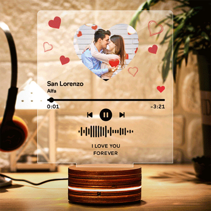 Customize your favorite pictures, song title, artist name on the acrylic plaque, and you can generate a unique Spotify code. Please note that the acrylic plaque itself does not emit music. You have to scan the code on the app, after scanning the code on Spotify, your song will start playing immediately. The night light will become the most unique decoration in the room, it is also the best perfect gift for friends, family, couple.