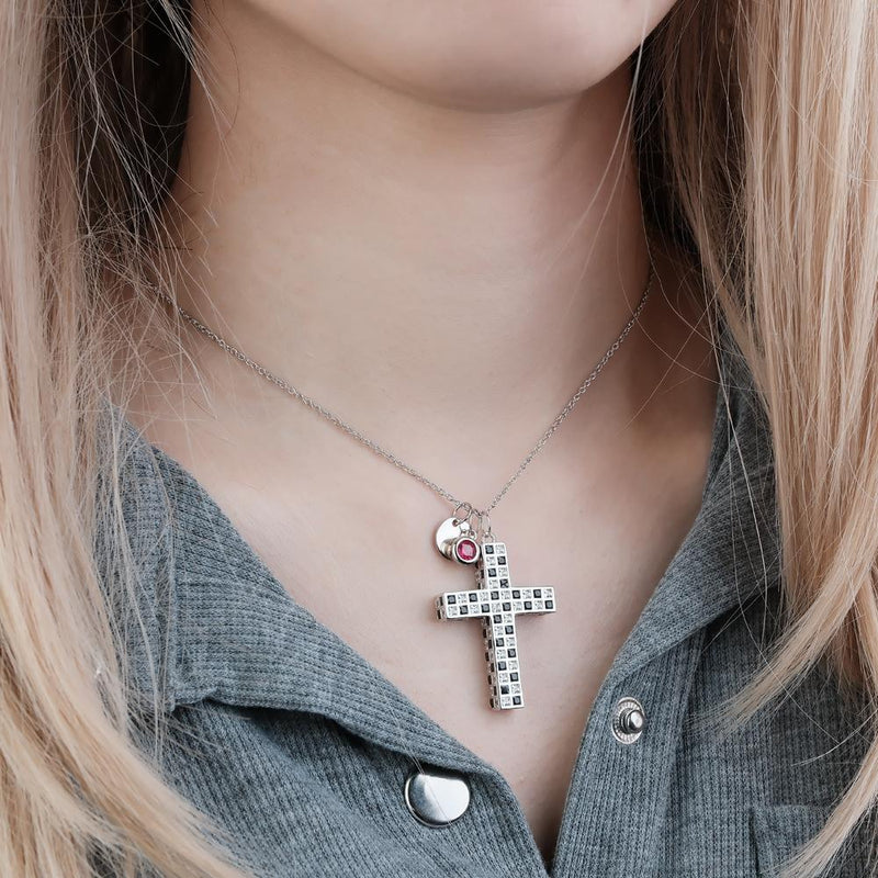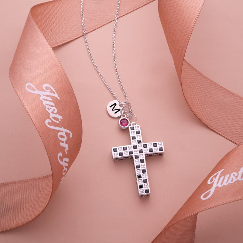 Celebrate your loved ones with this custom birthstone letter necklace featuring a stylish checkered flag cross design. This unique gift is perfect for any occasion and can be personalized with the initial of your choice. Made with high-quality materials, this necklace is both fashionable and meaningful. Surprise someone special with this one-of-a-kind piece that will surely be cherished for years to come.