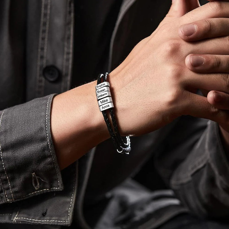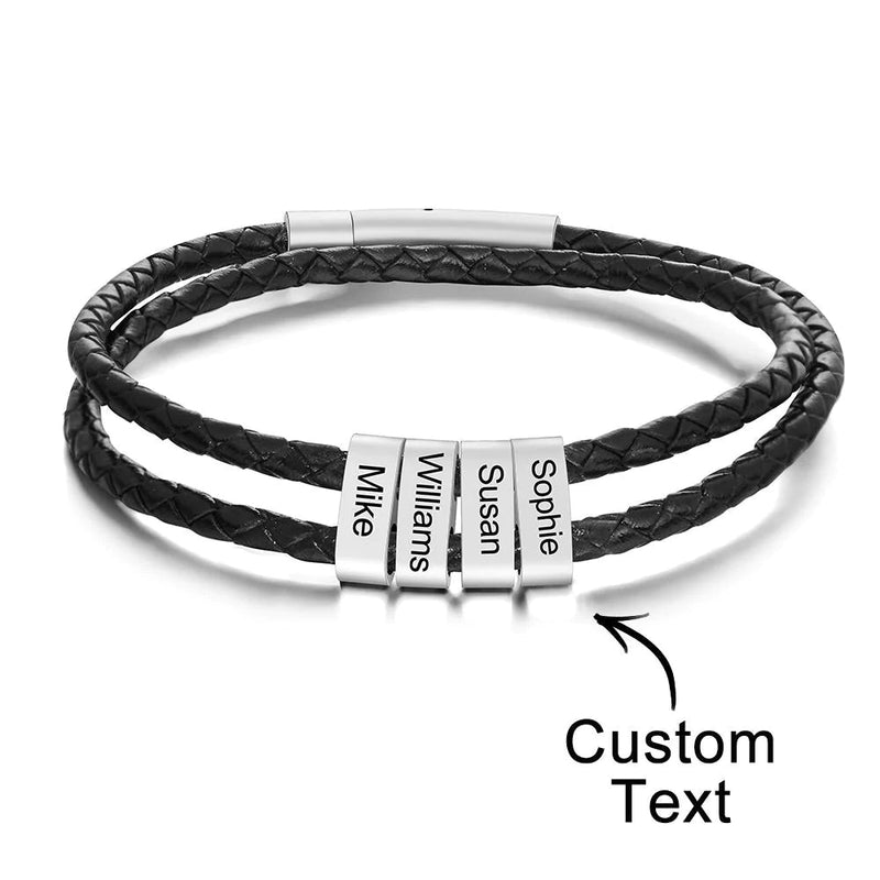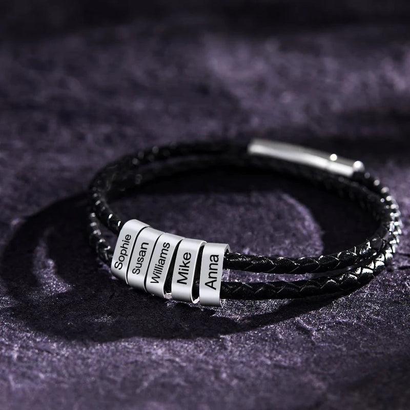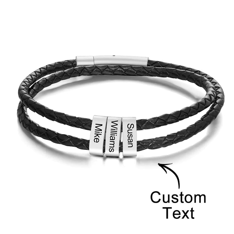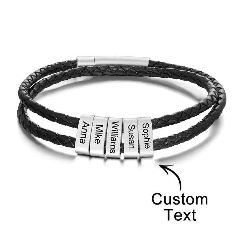 Keywords: Engraved bracelet, personalized gift, mens jewelry, leather beads, custom bracelet, braided design, unique accessory, handcrafted piece, stylish mens gift, customizable bracelet, personalized jewelry, engraved beads, braided leather.