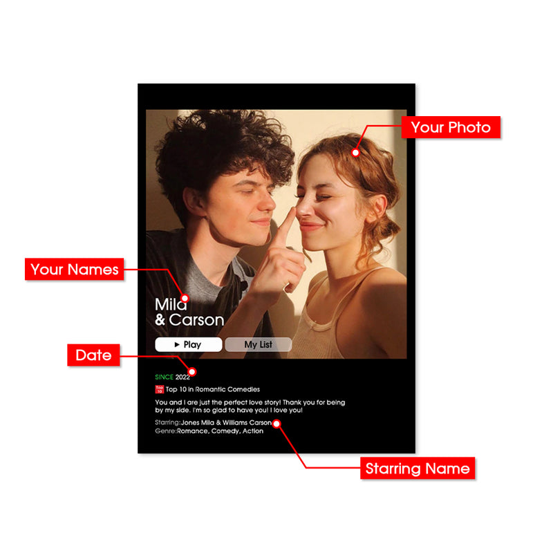 This personalized movie poster, where you can customize the image and text to create a unique and one-of-a-kind movie poster. With our user-friendly design platform, you can easily upload your own image and add your own text to make a poster that reflects your personality and style. Perfect for movie buffs, collectors, or anyone who wants to showcase their favorite film in a personalized way. Our high-quality prints are made on premium paper and come in various sizes to fit any space.