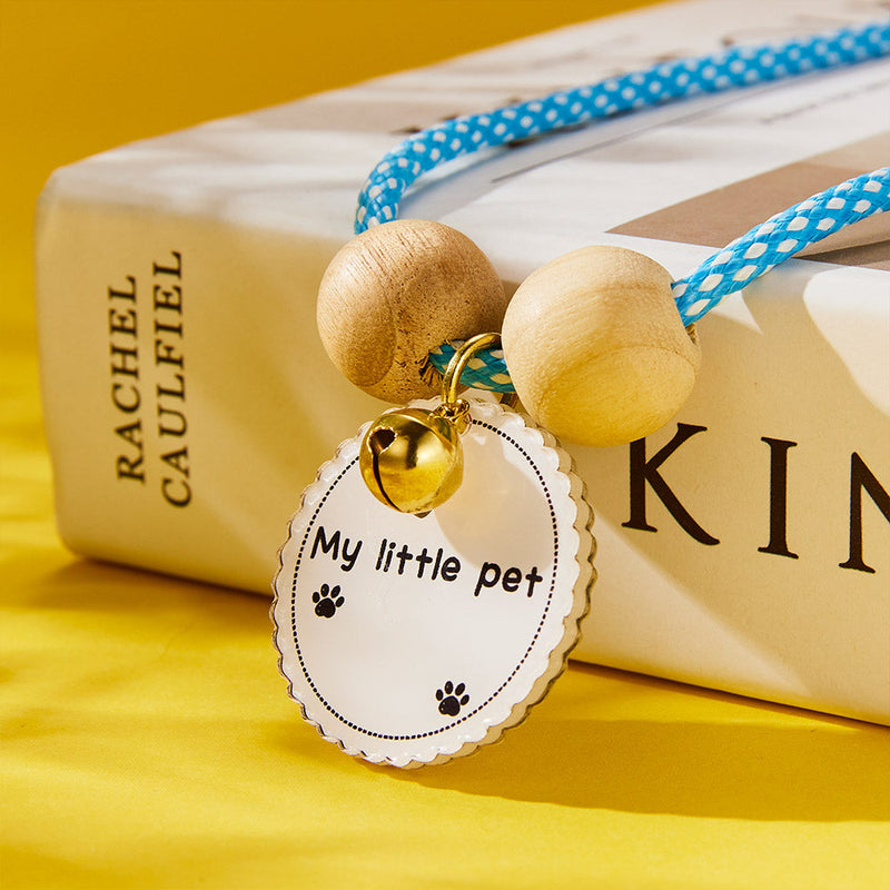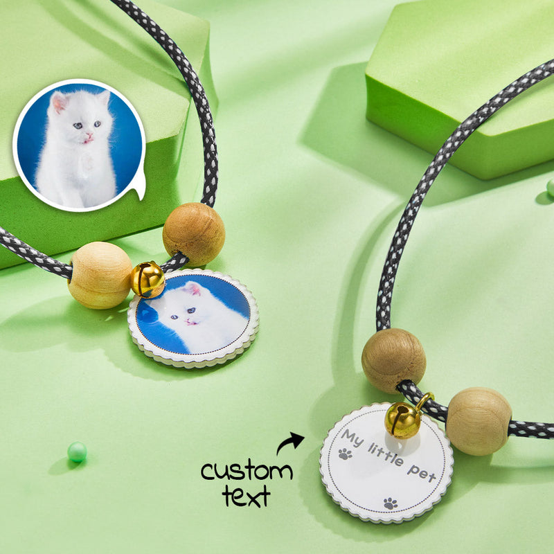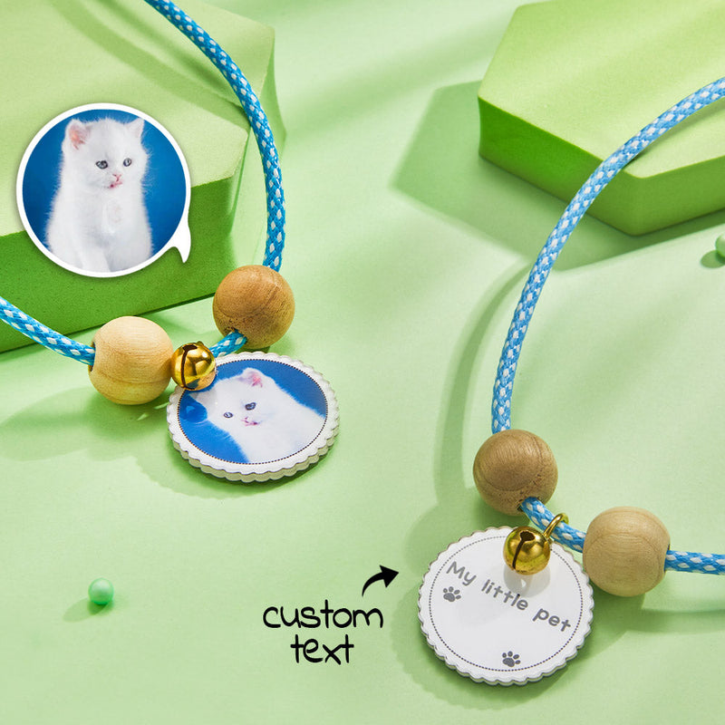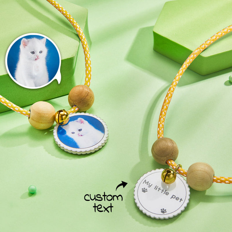 Come and customize a one-of-a-kind collar for your pet! This necklace has a variety of colors, with wooden beads and bells, and a photo + a line of text can be customized at the center of the round card customization, you can customize the photo of your pet and your information. The collar material is soft, does not hurt the pet's skin, and is highly comfortable. Come and buy it!