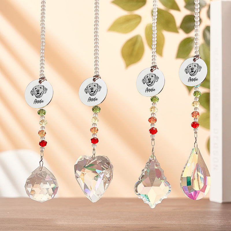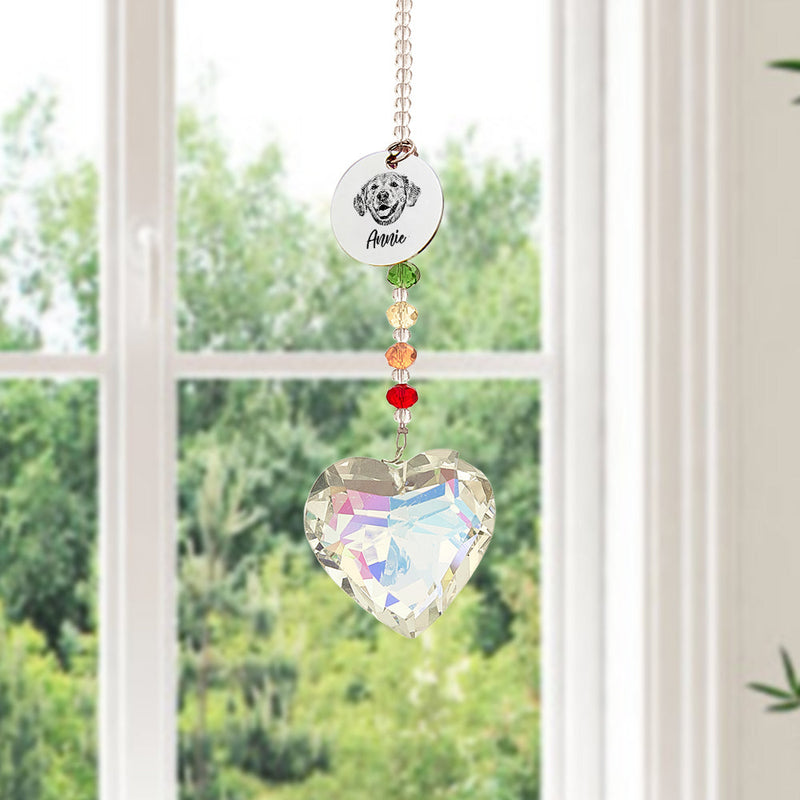 This custom rainbow suncatcher is a perfect way to honor your beloved pet. Made with high-quality crystal, it captures the light and reflects a beautiful rainbow. A thoughtful and heartfelt gift for pet lovers, this suncatcher serves as a lasting memorial for your cherished companion.