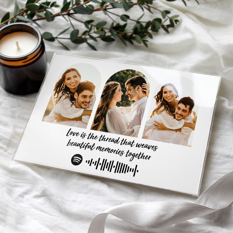Celebrate your special moments with our Custom Spotify Plaque featuring three photos. This unique anniversary gift is perfect for music lovers. Personalize it with your favorite song and pictures to create a memorable keepsake. The customizable frame displays the Spotify code of your chosen song. Just scan to play! A romantic and thoughtful gift that captures memories in a beautiful way.