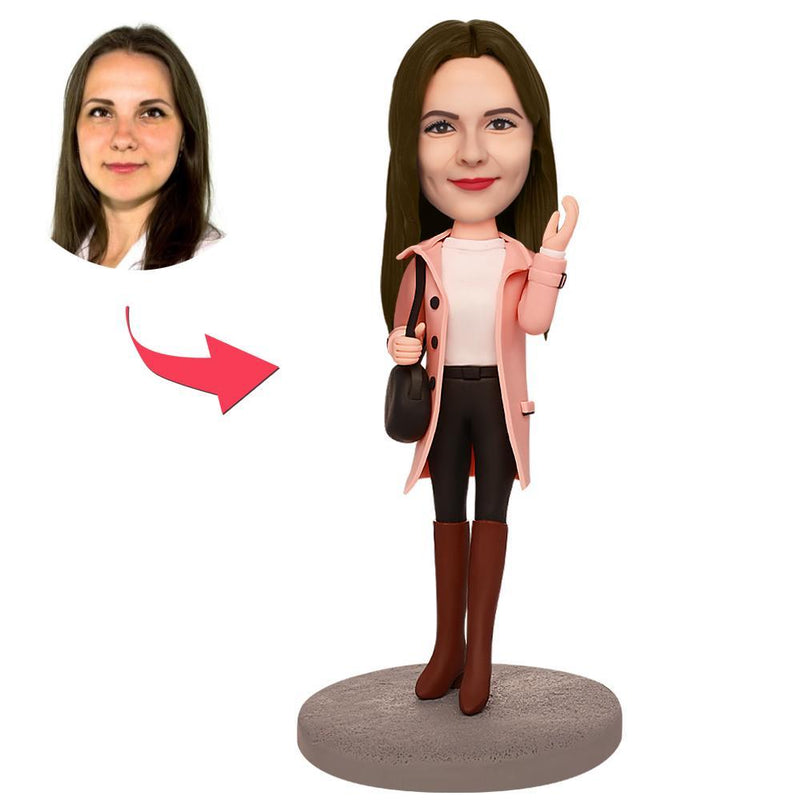 Girl in Overcoat Custom Bobblehead With Engraved Text