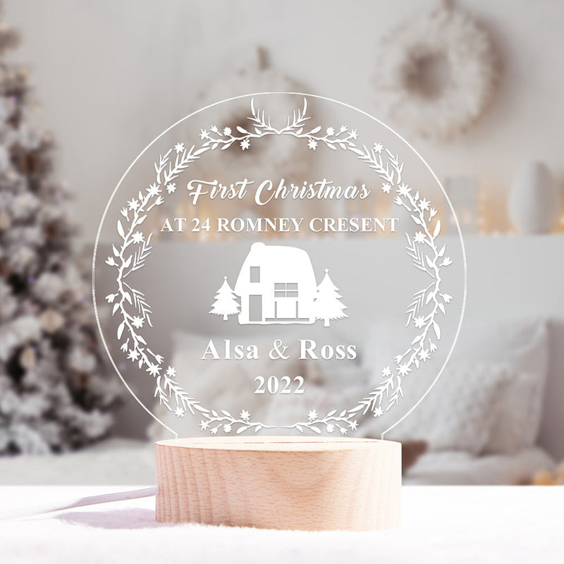 Illuminate your new home with our charming Christmas lamp. This personalized night light is a perfect decoration for celebrating your first home. Customize it with your house details and make it a unique bauble ornament. Ideal as a thoughtful gift for couples in 2022. Bring warmth and joy to your holiday season.