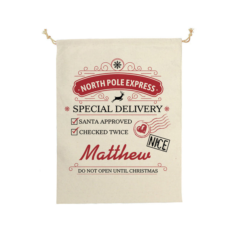 Personalised santa sack full of Christmas element, put your gifts in this bag, they will so exciting to get this exclusive bag from santa and have a wonderful memory.