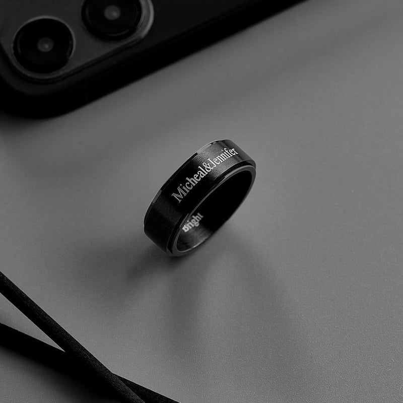 Personalized 8mm Stainless Steel Matt Black Quality Spinner Ring Great for any name or names with (heart logo) in between and a date or very short message.This ring is fashionable, and personalized. It is suitable for male friends or when going out to parties.