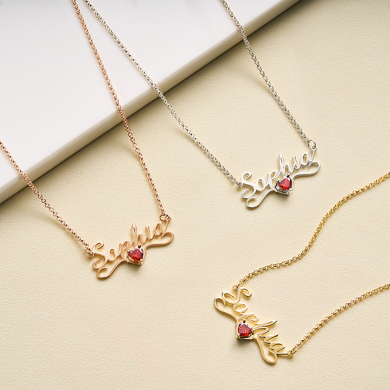 Make a statement that's undeniably you with our Personalized Name Necklace! Choose your name and add a heart-shaped birthstone to make it a one-of-a-kind gift for her. Show off your unique style with a touch of love and personality.