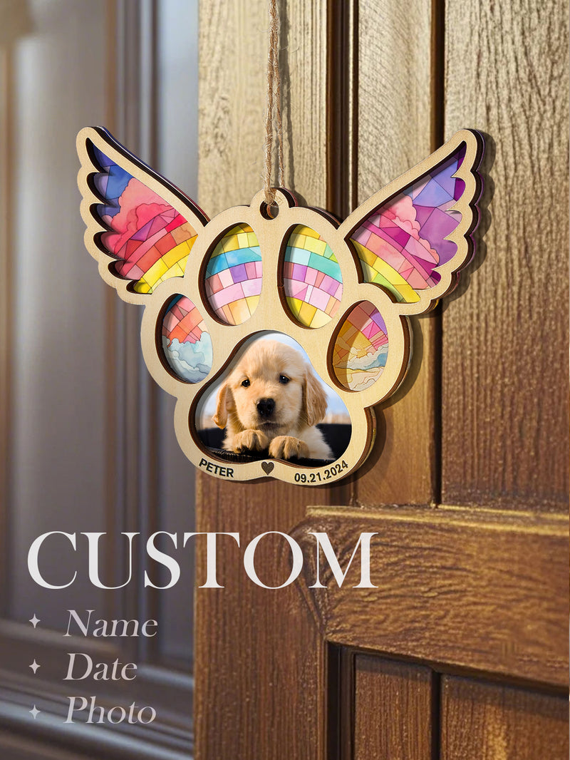 Celebrate the memory of your furry friend with our personalized pet suncatcher ornament. This special ornament features your pet's name and photo, making it a beautiful memorial gift for pet lovers. Each one is custom-made and captures the unique bond between you and your beloved pet.
