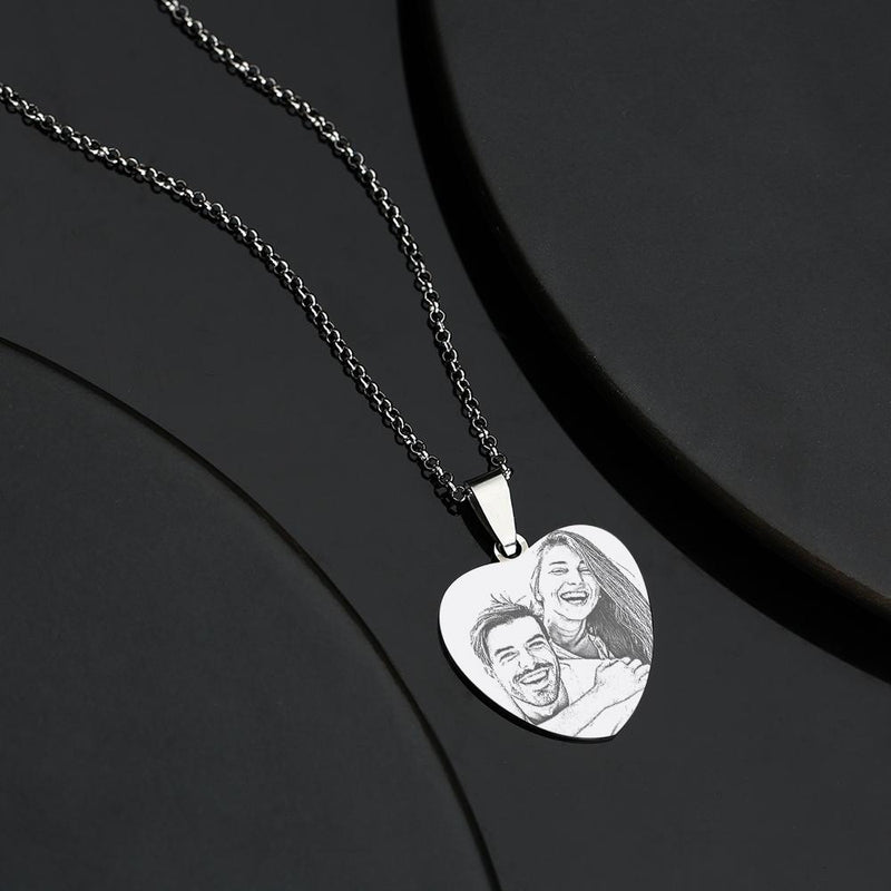 Womens necklace, heart pendant, photo engraving, tag necklace, stainless steel, personalized jewelry, custom gift, sentimental necklace, engraved pendant, photo jewelry, heart charm, keepsake necklace, meaningful accessory